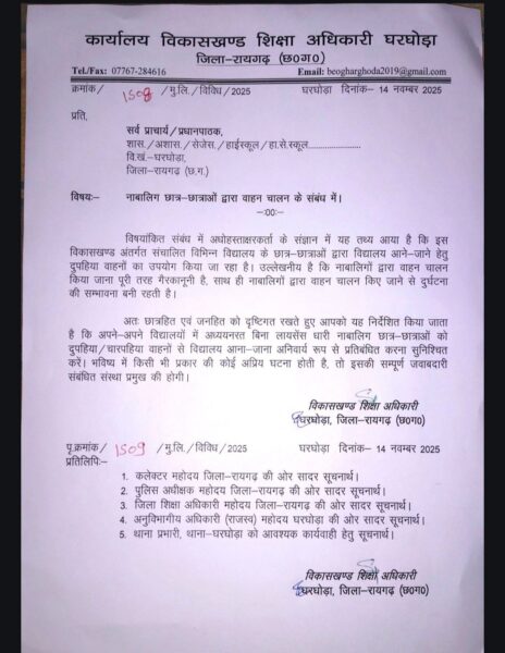 सुरक्षा को लेकर जारी इस निर्देश की प्रतिलिपि कलेक्टर रायगढ़, एसडीएम घरघोड़ा, थाना प्रभारी घरघोड़ा, डीईओ रायगढ़ तथा पुलिस अधीक्षक रायगढ़ को भेजी गई है, जिससे स्पष्ट है कि अब मामला केवल शिक्षा विभाग तक सीमित नहीं रहेगा। पुलिस, प्रशासन और स्कूल—तीनों मिलकर एक संयुक्त कार्रवाई के लिए तैयार दिख रहे हैं। अधिकारियों का मानना है कि नाबालिग वाहन संचालन सिर्फ यातायात नियमों का उल्लंघन नहीं, बल्कि समाज में फैल रही असावधानी की एक खतरनाक मिसाल है, जिसे समय रहते नियंत्रित करना बेहद जरूरी है। प्रशासनिक स्तर पर यह सख्ती आने वाले दिनों में सड़क सुरक्षा अभियान को और मजबूत आधार देती दिखेगी।