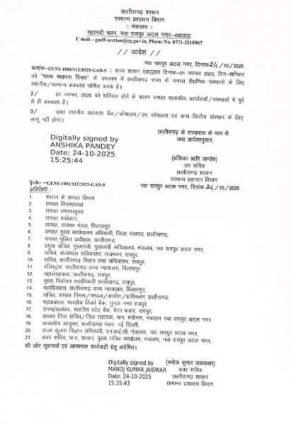 छत्तीसगढ़ में इस बार राज्योत्सव पर स्कूलों एवं कालेजो में अवकाश घोषित किया गया है । शनिवार होने की वजह से कार्यालयो में पहले से ही छुट्टियां होंगी ऐसे में राज्य सरकार ने आदेश निकालकर स्कूलों और कॉलेजों में भी छुट्टियों का एलान किया है । यह छुट्टियां शासकीय प्राइवेट सभी संस्थाओं के लिए लागू होगी ।