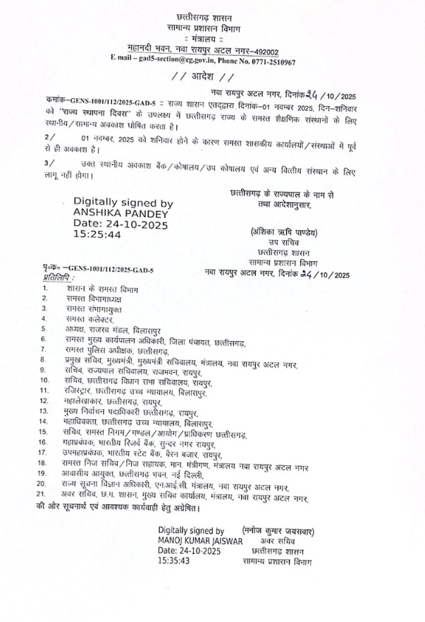 छत्तीसगढ़ में इस बार राज्योत्सव पर स्कूलों एवं कालेजो में अवकाश घोषित किया गया है । शनिवार होने की वजह से कार्यालयो में पहले से ही छुट्टियां होंगी ऐसे में राज्य सरकार ने आदेश निकालकर स्कूलों और कॉलेजों में भी छुट्टियों का एलान किया है । यह छुट्टियां शासकीय प्राइवेट सभी संस्थाओं के लिए लागू होगी ।