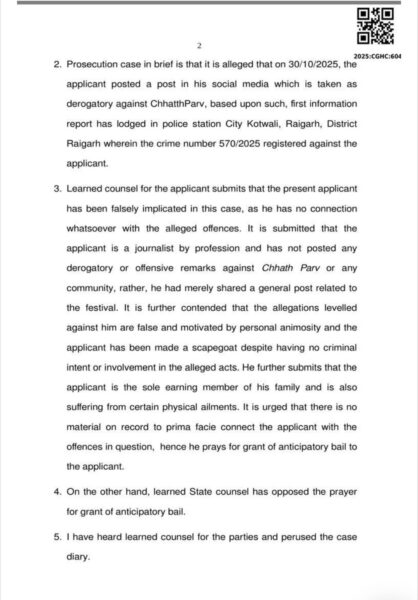 छत्तीसगढ़ हाईकोर्ट ने चंद्रकांत शर्मा उर्फ टिल्लू शर्मा को बड़ी राहत देते हुए शर्तों के साथ अग्रिम जमानत प्रदान की है। मामला सिटी कोतवाली थाना क्षेत्र का है, जहां छठ पर्व से जुड़ी एक सोशल मीडिया पोस्ट को लेकर आपत्ति जताई गई थी। इस पोस्ट के बाद पुलिस ने भारतीय न्याय संहिता की धारा 196 और 299 के तहत एफआईआर दर्ज की थी। पुलिस का कहना था कि पोस्ट से सामाजिक सौहार्द प्रभावित होने की आशंका थी, जिसके चलते कार्रवाई की गई।