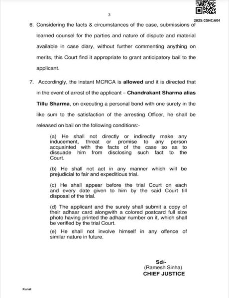 छत्तीसगढ़ हाईकोर्ट ने चंद्रकांत शर्मा उर्फ टिल्लू शर्मा को बड़ी राहत देते हुए शर्तों के साथ अग्रिम जमानत मंजूर कर ली है। यह मामला सिटी कोतवाली थाना क्षेत्र से जुड़ा है ।