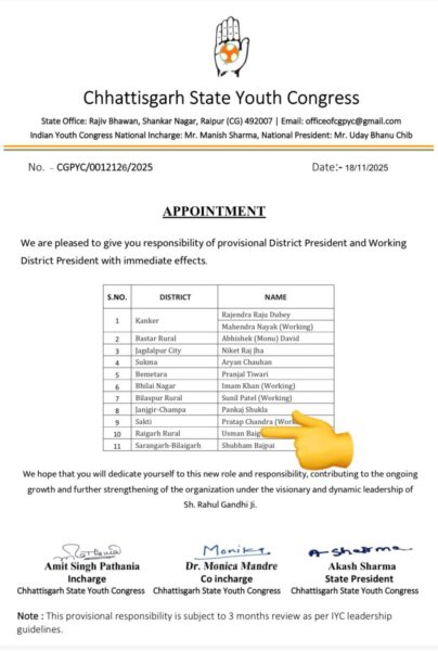 प्रदेश और जिला नेताओं की अनुशंसा पर मिली जिम्मेदारी, नई ऊर्जा से भरेगा संगठन